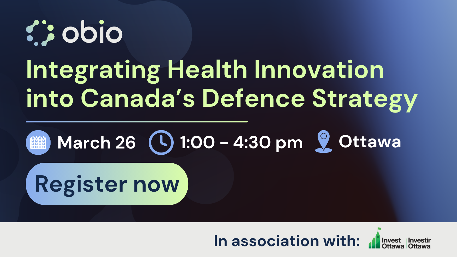 OBIO®, in partnership with Invest Ottawa, is pleased to host an event featuring industry leaders who will address how Canada can leverage domestic innovations in dual-use HealthTech and Life Sciences to build a robust, domestic industrial base to strengthen Canada’s sovereignty and security.
